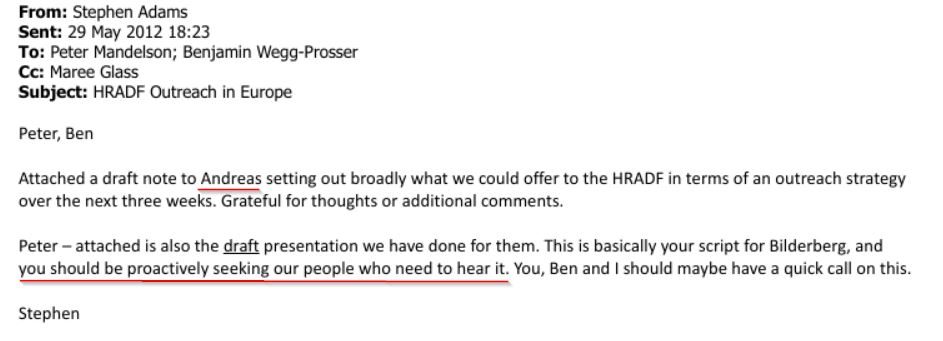 Η παρούσα ανάλυση επικεντρώνεται μόνο σε ένα e‑mail που απευθύνεται στον Mandelson. Φέρει ημερομηνία 29 Μαΐου 2012. Δύο ημέρες αργότερα, 140 κορυφαίες προσωπικότητες από κεντρικούς τομείς της κοινωνίας – οικονομία, πολιτική, επιστήμη – επρόκειτο να συγκεντρωθούν στις ΗΠΑ για τη διάσκεψη Bilderberg, τη κατά το ήμισυ μυστική διάσκεψη. Η σύνοδος των πλουσίων και ισχυρών πραγματοποιήθηκε εκείνη τη χρονιά στο Chantilly, στην πολιτεία Virginia, κοντά στην Washington DC.